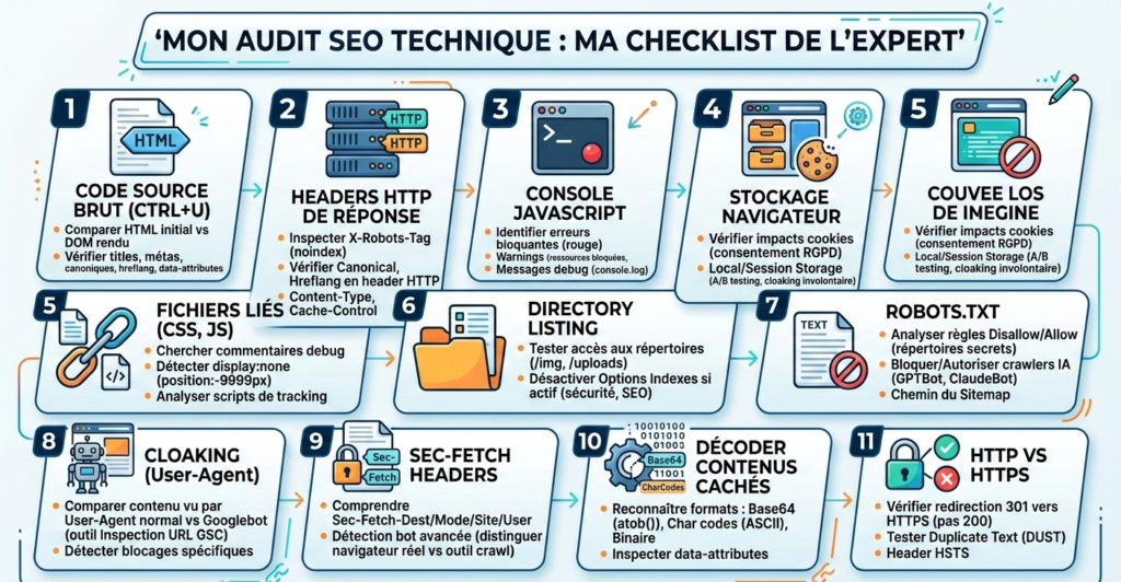 La plupart des référenceurs savent vérifier une balise title ou une meta description. C’est le b.a.-ba. Mais un véritable audit SEO technique va beaucoup plus loin : il faut savoir lire les headers HTTP, décoder du Base64, détecter du cloaking, et fouiller les recoins du code source que personne ne regarde.